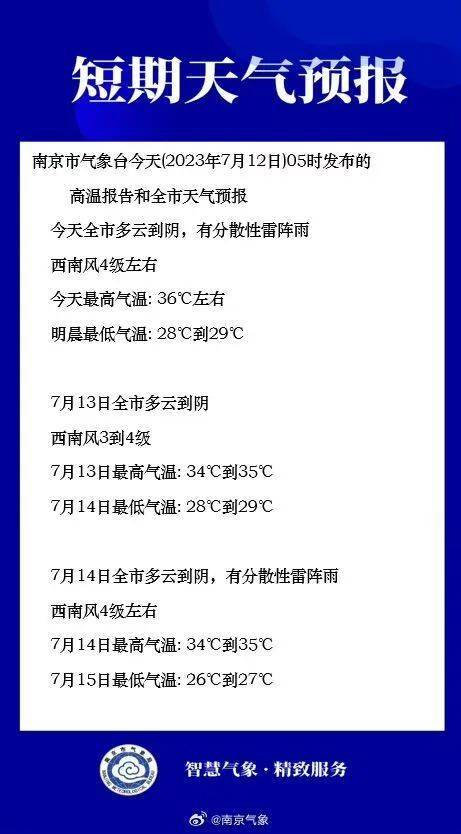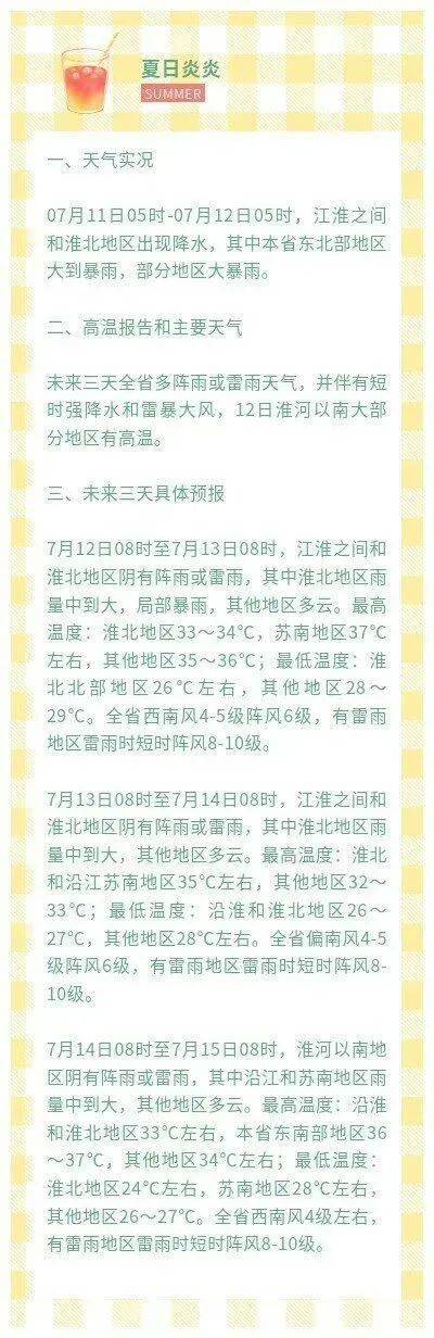 7月12日08时至7月13日08时,江淮之间和淮北地区阴有阵雨或雷雨,其中淮北地区雨量中到大,局部暴雨,其他地区多云。最高温度:淮北地区33~34℃,苏南地区37℃左右,其他地区35~36℃;最低温度:淮北北部地区26℃左右,其他地区28~29℃。全省西南风4-5级阵风6级,有雷雨地区雷雨时短时阵风8-10级。