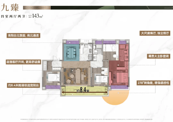 和市场主流140㎡+户型餐厅和客厅“拼凑”而成的大横厅不同的是,做到了开间约8.4米的超长跑道阳台+独立餐厅+大尺度横厅,主卧270°观景转角窗,舒适度拉满;