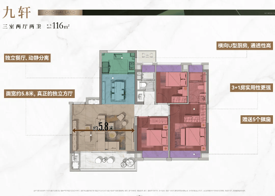 建面约116㎡户型,三房两卫