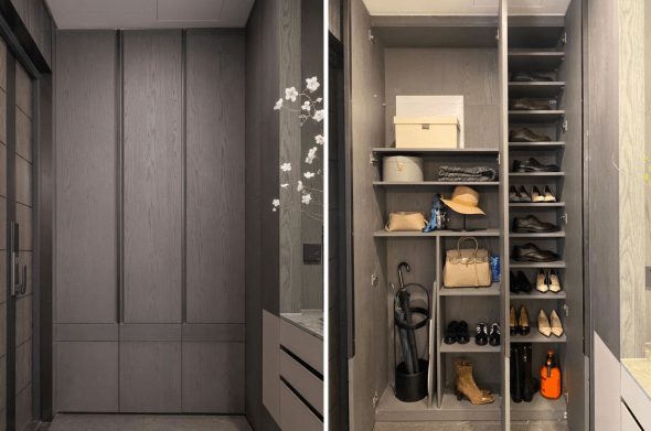 值得一提的是,为避免厅堂附近户内开门的影响,在内装设计上,所有户内门全部为隐门设计,关上门以后,四面的材质线条对缝达到高度一致!