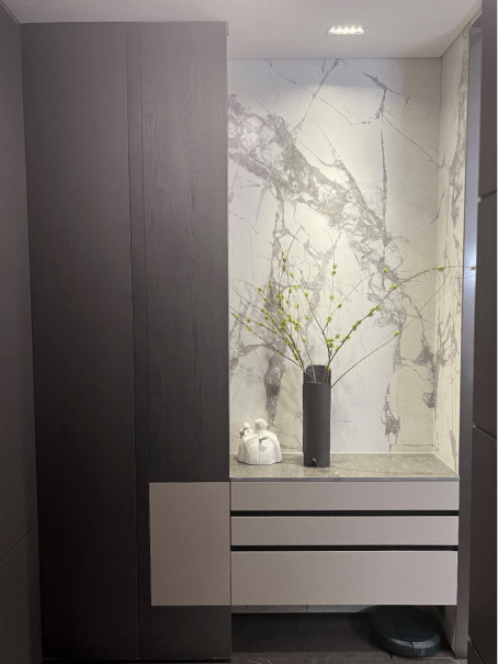 汇文府就尊重并沿袭这种优秀的“礼仪精神”,以寒江雪岩板打造了景墙式的入户玄关。更定制了大理石台面的玄关吊柜,下面可以放置扫地机器人和外出穿的鞋子