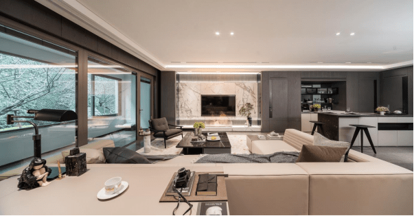 科技系统的应用释放了内部空间净高,同时顶面可完全拉通为一个整体,配合无主灯吊顶的设计,让极简风格得到较大化诠释。简约的线条辅以多层次特调冷暖度的光源设计,空间呈现出“刚刚好”的舒适状态。