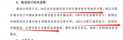 150日内提交城市设计、控制性详细规划、交通市政专题最终成果报批;