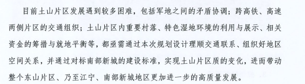 目前土山片区发展遇到较多困难,包括军地之间的矛盾协调;跨高铁、高速两侧片区的交通组织;土山片区内重要村落、特色湿地环境的利用与展示、相关资金的筹措与就地平衡等,都亟需通过本次规划设计理顺交通联系、组织好地区空间关系,并通过对标南部新城的建设标准,实现土山片区质的变化,进而带动整个东山片区、乃至江宁、南部新城地区更加进一步的高质量发展。