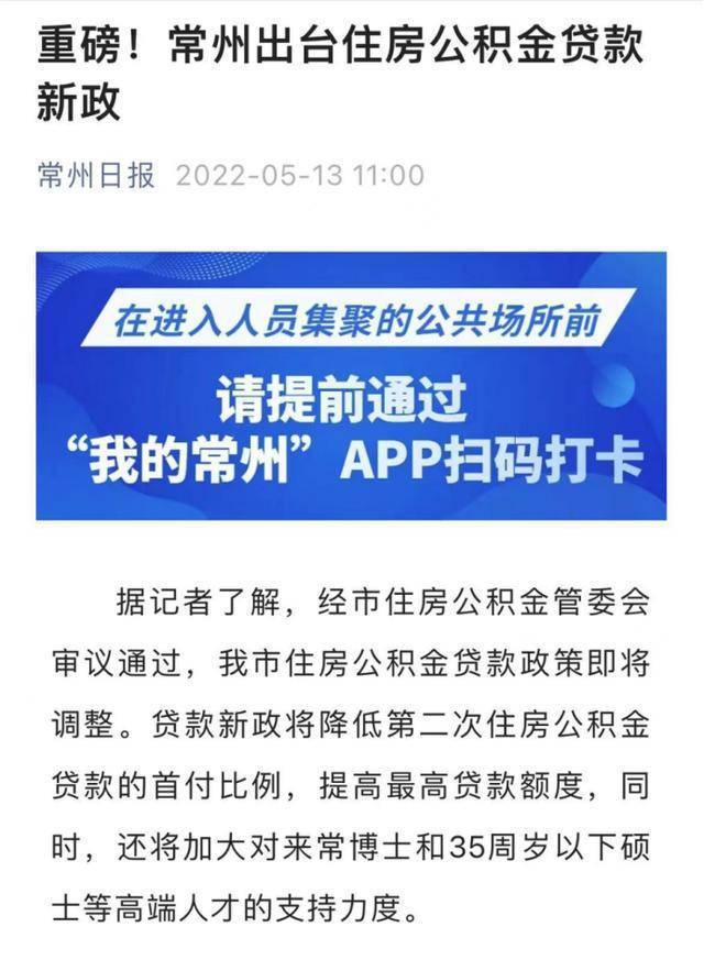 同日,常州日报公众号发布消息称,常州市住房公积金贷款政策即将调整。贷款新政将降低第二次住房公积金贷款的首付比例,提高较高贷款额度,同时,还将加大对来常博士和35周岁以下硕士等高端人才的支持力度。