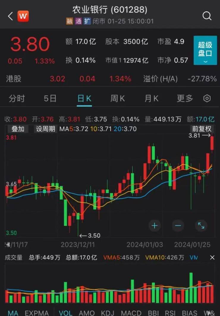 此外,农业银行股价今日盘中再创新高,达到3.81元/股。截至收盘,农业银行报收3.80元/股,涨幅1.33%。