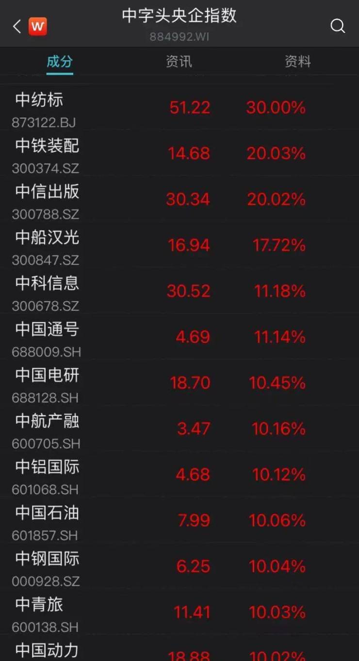 板块方面,中字头股票全线爆发,个股掀起涨停潮,中国石油、中国联通、中国医药、中国海诚、中粮资本、中成股份等超20股集体封板。上海本地股持续大涨,上海凤凰、上海易连、长江投资、上海物贸等超10股涨停。大金融板块继续走强,华鑫股份、南华期货、建元信托等涨停。房地产板块全线反弹,中华企业、光大嘉宝、京能置业、新黄浦等涨停。