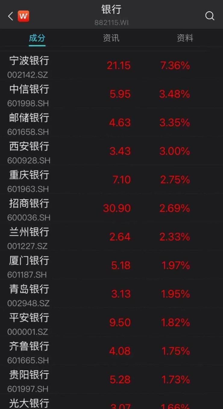 银行板块再度集体上涨。截至收盘,Wind银行指数的42家银行股中,41只银行翻红。