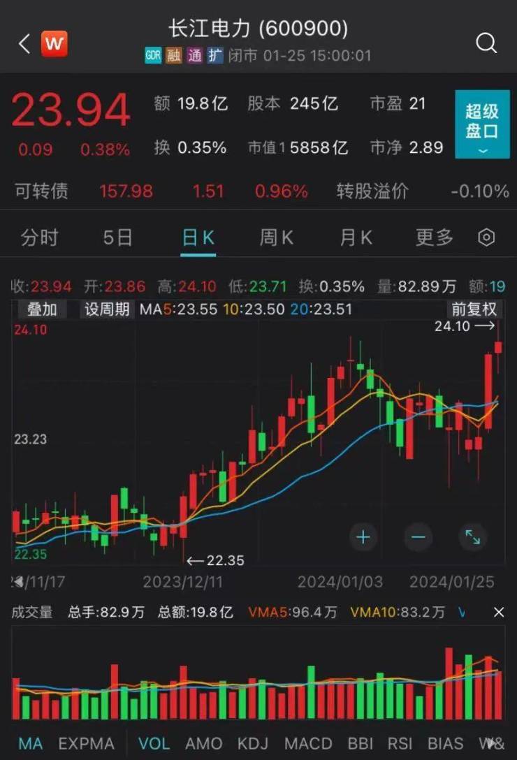 1月23日~25日,长江电力已连涨3个交易日。