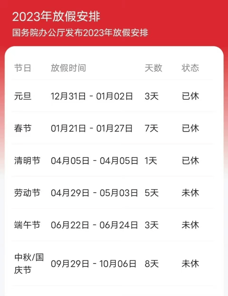 今年剩余的假期余额就只剩6天了。分别是五一1天,端午节1天,中秋1天,国庆3天。