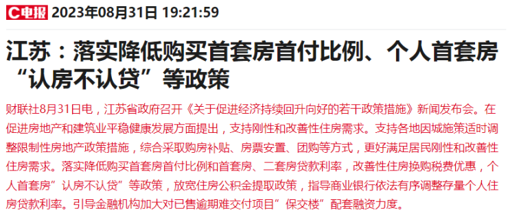 2、江苏发布“28条措施”,在房地产方面,明确提出:支持各地因城施策适时调整限制性房地产政策措施,落实降低购买首套房首付比例和首套房、二套房贷款利率,改善性住房换购税费优惠,个人首套房”认房不认贷”等政策,放宽住房公积金提取政策,指导商业银行依法有序调整存量个人住房贷款利率。