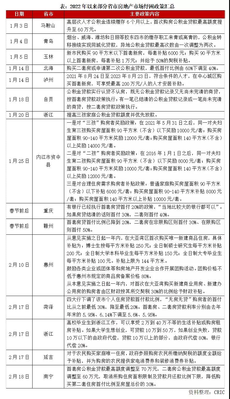 可以看到的是,近期以来,首付降低的城市数量正在增加。除上述提到的驻马店,据易居研究院智库中心的监测数据,截至目前,全国至少已有7个城市出现了首付比例下调的情况,其中包括公积金首付比例下调的三个城市,即北海、自贡、南宁,以及商业贷款下调首付比例的四个城市,即菏泽、重庆、赣州、佛山。据克而瑞地产研究监测数据,2022年以来,浙江、南宁、菏泽等14个省市相继落地房地产纾困政策,主要涉及内容包括三个方面。