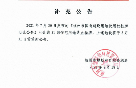 8月18日,杭州市规划与自然资源局网站发布补充公告称,终止挂牌第二批集中供应的住宅地块,共计31宗,将于8月31日之前重新公告 。