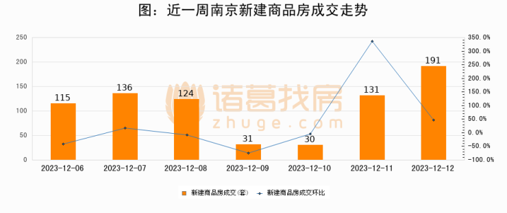 根据南京市住房保障和房产局数据显示,2023年12月12日南京新建商品房成交191套,较昨日增加60套,环比上涨45.8%