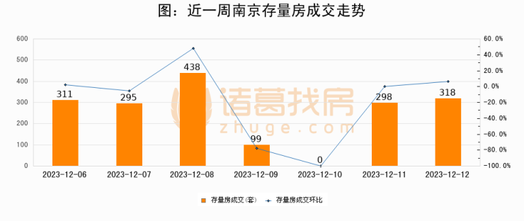 从存量房来看,2023年12月12日南京存量房单日成交318套,比昨日增加20套,环比上涨6.7%。从近一周存量房成交来看,南京存量房日均成交套数为251套,12月12日单日成交318套,高于近一周平均水平26.7%。