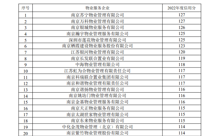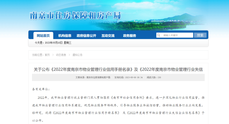 近日,南京2022年度物业红黑榜发布。南京市住房保障和房产局发布通知,公布了2022年度南京市物业管理行业信用手册名录和失信企业信息名录。