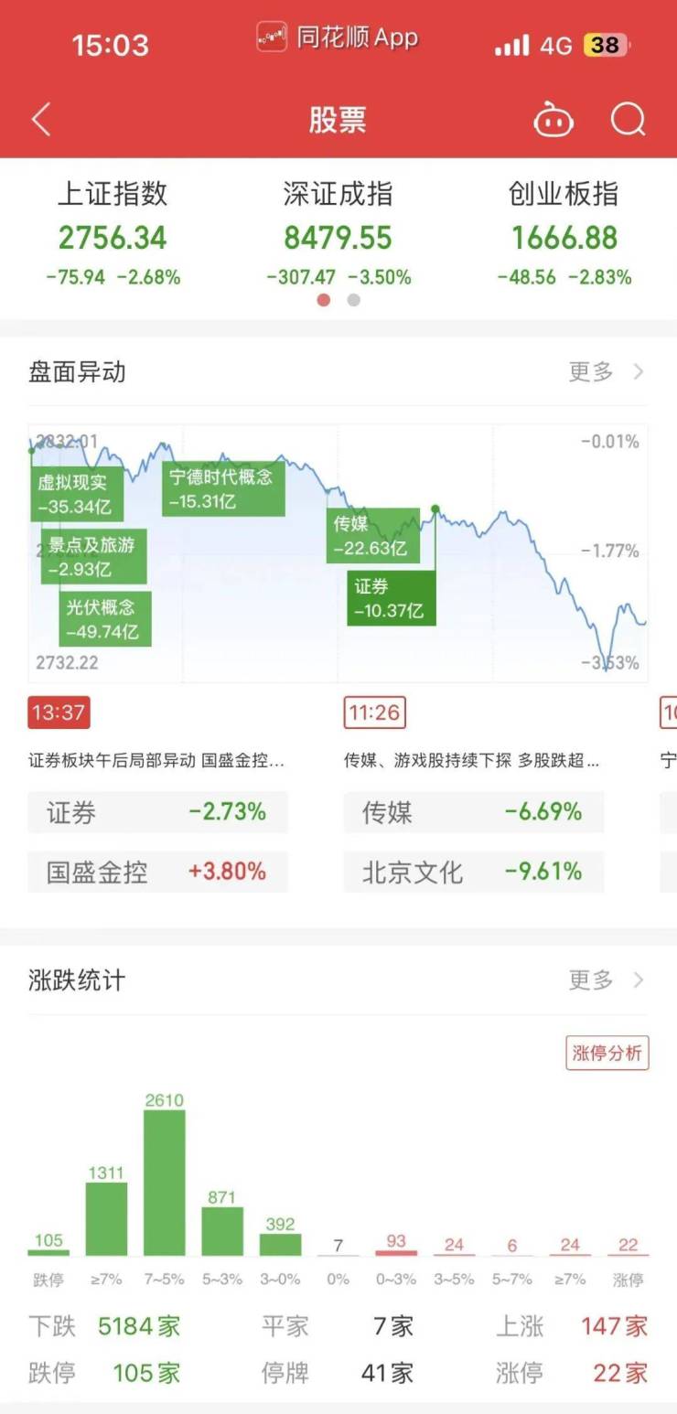 1月22日,A股三大指数集体收跌,沪指再度跌破2800点。早间,三大指数集体低开,随后全天维持单边下挫走势。截至收盘,沪指跌2.68%,报2756.34点,深成指跌3.50%,报8479.55点,创业板指跌2.83%,报1666.88点。