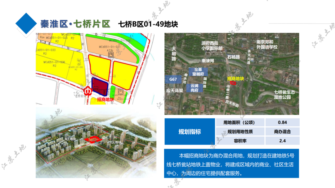 除此以外,夹在七桥F4中间的七桥B区01-49地块为商办混合用地,规划打造5号线七桥瓮站地铁上盖物业,建设区域内的商业、社区生活中心,未来也能满足基本生活需求,但想要看个电影、逛个商场可能得坐上两站地铁前往华夏幸福或金地的商业项目。该地块为南京市第二、第三批集中出让土地,也将在年内出让。
