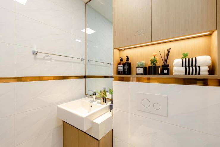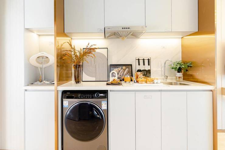江北砂之船慧湾公寓,严格把控室内精装品质,采用开来通顶储物柜、奥维石英石台面、老板油烟机、摩恩水槽,并预留洗衣烘干机位置。