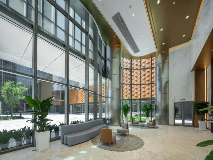 傍晚回家,穿过星级酒店式的旋转门,层高约11.2米的入户大堂跃然眼前,这里有星级前台服务接待、尊崇会客区、精美水晶吊灯点缀,空间通透敞亮,高端大气,给业主满满的归家仪式感。