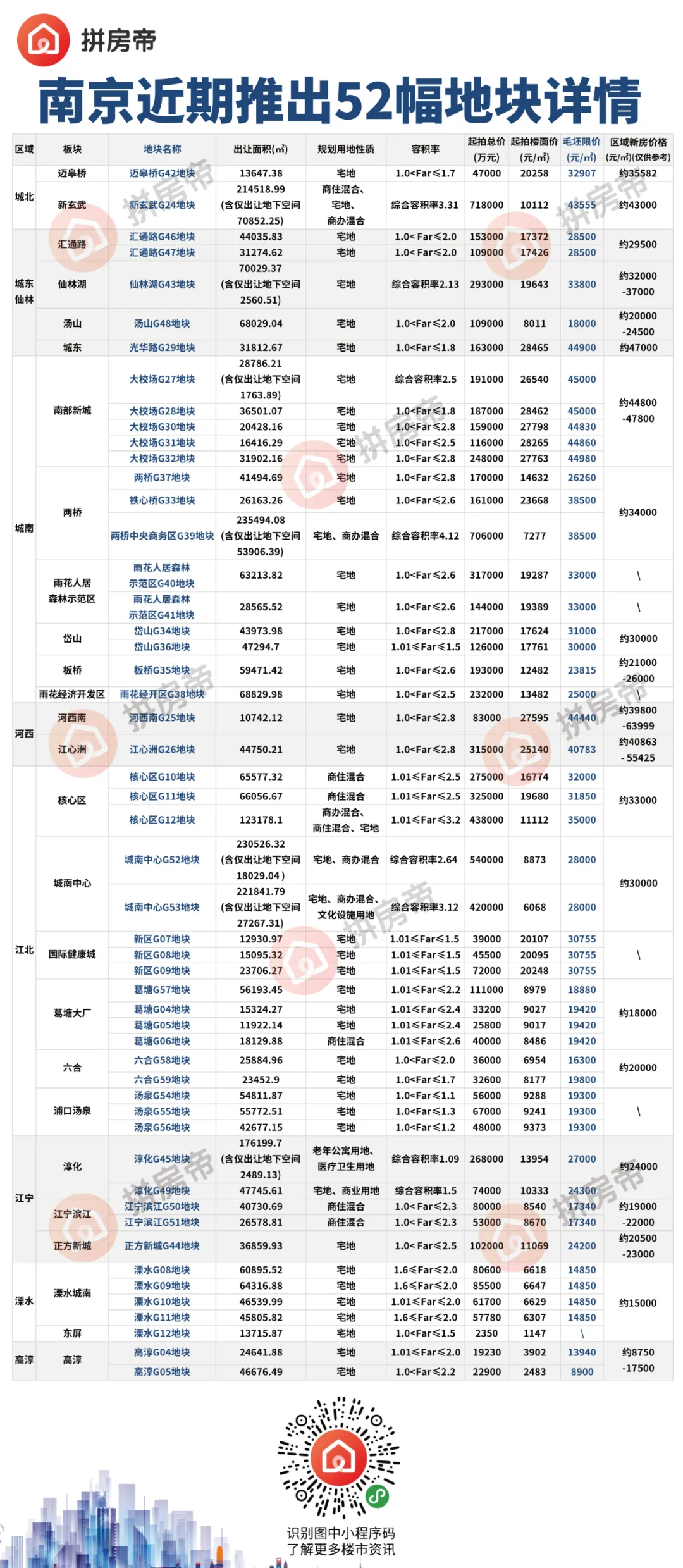 在这批将于下月出让的52块地中,大校场毛坯限价4.5万/㎡,河西南毛坯限价4.44万/㎡,新玄武毛坯限价4.36万/㎡,江心洲毛坯限价4万/㎡,雨核毛坯限价3.85万/㎡,江核毛坯限价3.5万/㎡,仙林湖毛坯限价3.38万/㎡......