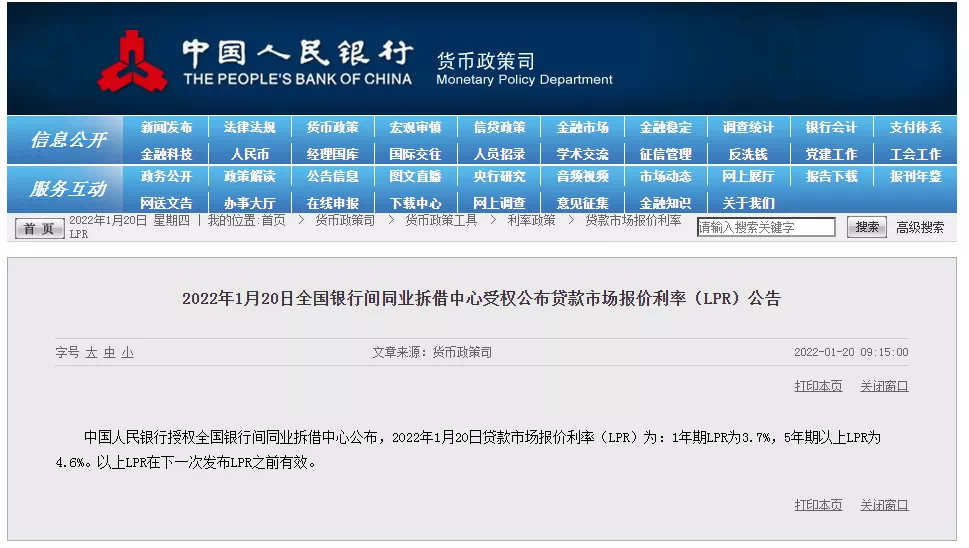 刚刚,中国人民银行授权全国银行间同业拆借中心公布,2022年1月20日贷款市场报价利率(LPR)为:1年期LPR为3.7%,5年期以上LPR为4.6%。以上LPR在下一次发布LPR之前有效。