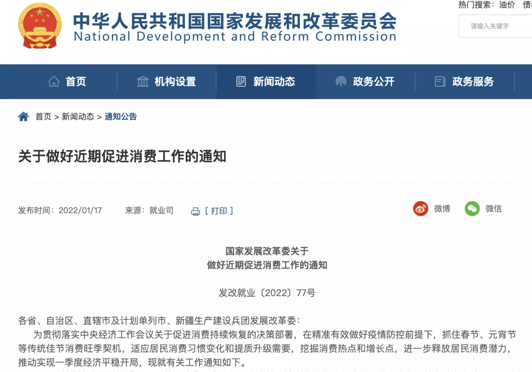 17日,国家发改委发布《关于做好近期促进消费工作的通知》。其中提到,抓住春节、元宵节等传统佳节消费旺季契机;促进住房消费健康发展!支持商品房市场更好满足购房者的合理住房需求。因城施策促进房地产业良性循环和健康发展。