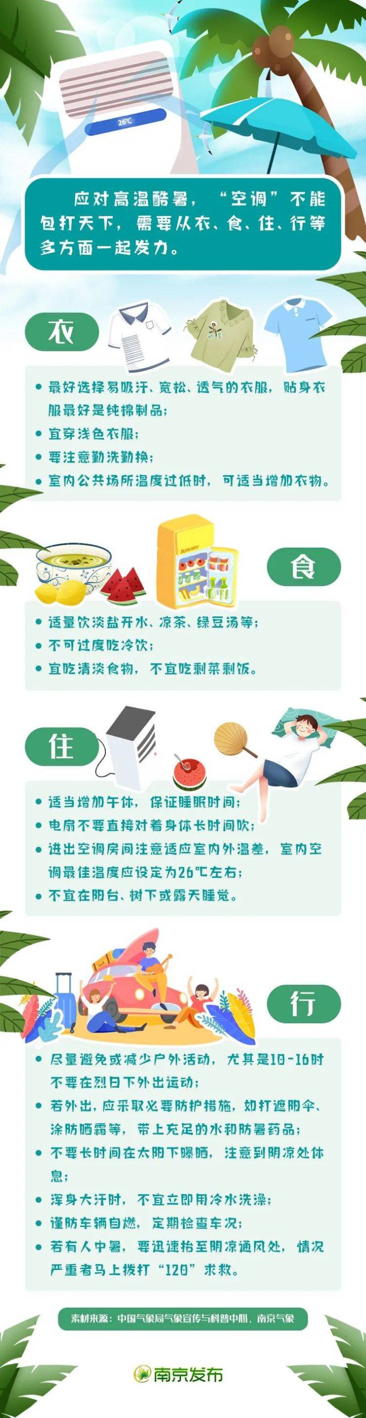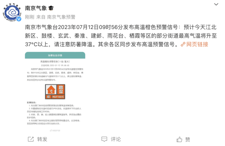 刚刚南京市气象台发布高温橙色预警信号预计今天江北新区、鼓楼、玄武、秦淮、请注意防暑降温!入伏第二天今天副高继续控制我市相信大家一早就感受到了气温的“烧烤”模式如何应对高温?这份小贴士您收好!⬇️ 天气炎热小布…