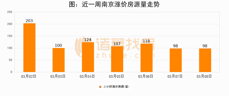 根据诸葛找房数据显示,南京24小时涨价房源量为98套,较03月07日持平。