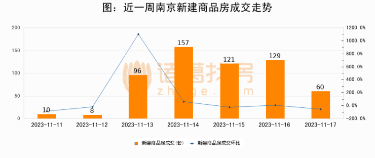 根据南京市住房保障和房产局数据显示,2023年11月17日南京新建商品房成交60套,较昨日减少69套,环比下降53.5%