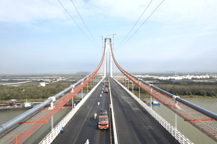 11月2日,仙新路过江通道主桥钢桥面铺装下层浇注式沥青混凝土施工顺利完成。