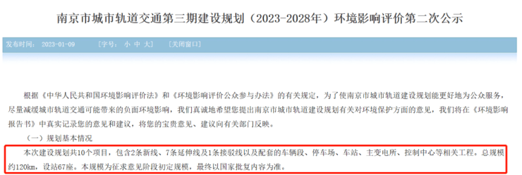 近日,南京城市轨道交通第三期建设规划(2023-2028年)环评公众意见征询公示出炉。