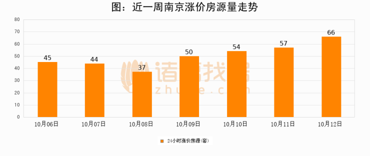 根据诸葛找房数据显示,南京24小时涨价房源量为66套,较10月11日增加9套,环比上涨15.8%。与此同时,涨价房源占比小幅扩大,业主信心有所提升。