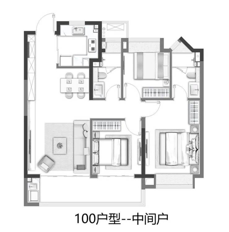 100㎡三房两厅两卫双阳台的格局,这种户型在南京比较常见,但一般楼盘需要105-110㎡才能做出来,璀璨璟园100㎡给你搞定,降低了总价。