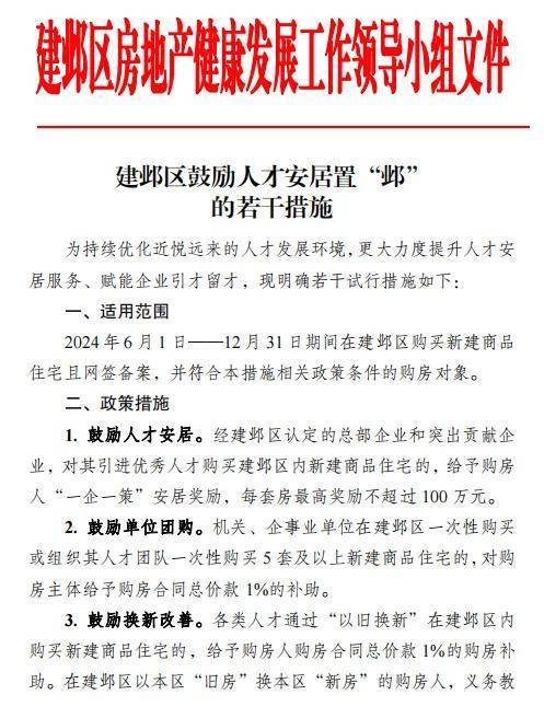 建邺区出台人才安居新政:人才买房最高奖励100万元,单位团购、以旧换新给1%补助!