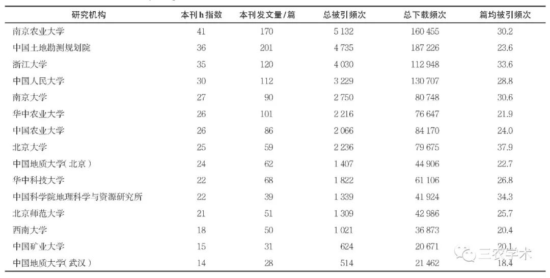 开展土地科学研究的机构为全国开设有土地管理学、土地经济学、土地利用与规划学、土地工程与技术学、地籍学等相关学科的高校和科研院所, 分析评价这些研究机构的学术影响力, 可以掌握各研究机构在土地科学研究领域内的科研实力、学术水平、研究地位等, 进而可以在今后的选题策划、学术研讨等活动中有针对性地开展合作。h指数除能评价研究者的学术水平之外, 也可以用于机构研究水平等相关主体的评价。由于大多数研究机构的研究方向较为分散, 为明确显示各机构在土地科学领域内的研究水平, 本文仅考虑各机构在《中国土地科学》上发表文章的h指数。