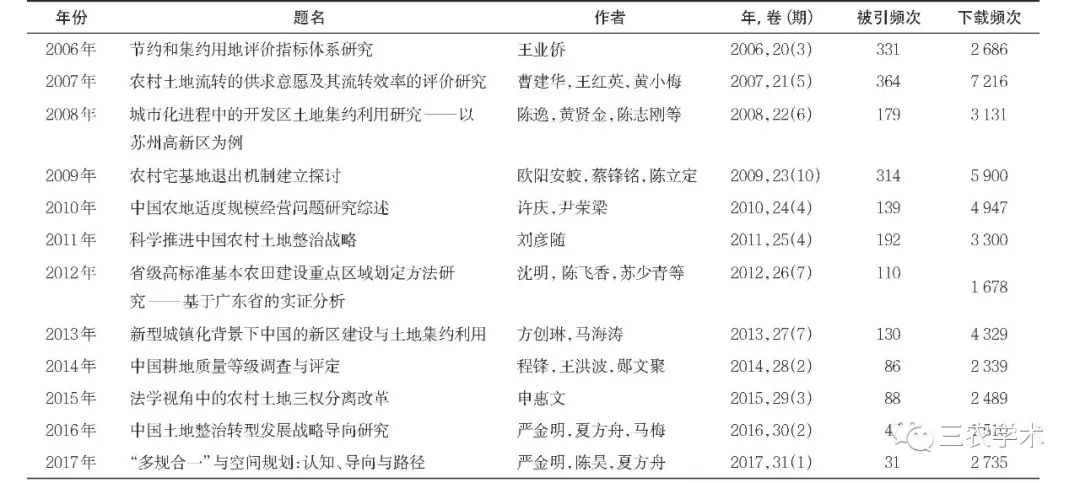 表2 2006—2017年《中国土地科学》年度高影响力论文分析