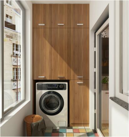 阳台沿着一端的墙壁设计一面通到棚顶的柜子,宽敞的储物空间可以轻松存放不常用的行李箱和清洁用品,地面上铺满五彩的瓷砖,闲暇和猫咪一起玩耍,增添温馨的生活的气。