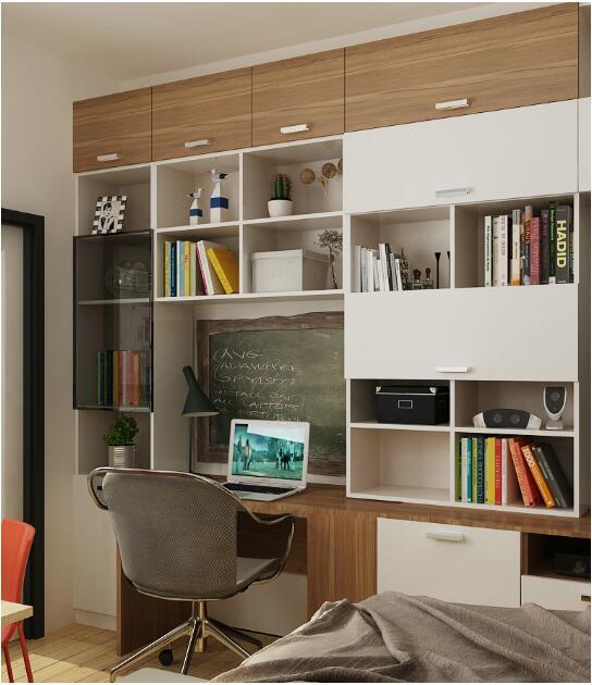整个卧室的墙面,妥善规划空间大小和家具安排,电视柜墙面两侧柜子隔断增强收纳,且形成一个小小的工作区,将工作区与电视柜整合在一起,满足个人工作、休息的需求。