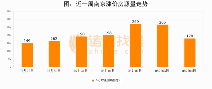 根据诸葛找房数据显示,南京24小时涨价房源量为178套,较08月03日减少87套,环比下降32.8%。与此同时,涨价房源占比小幅回落,对于购房者来说是一个入市窗口期,购房者可抓住时机入市。