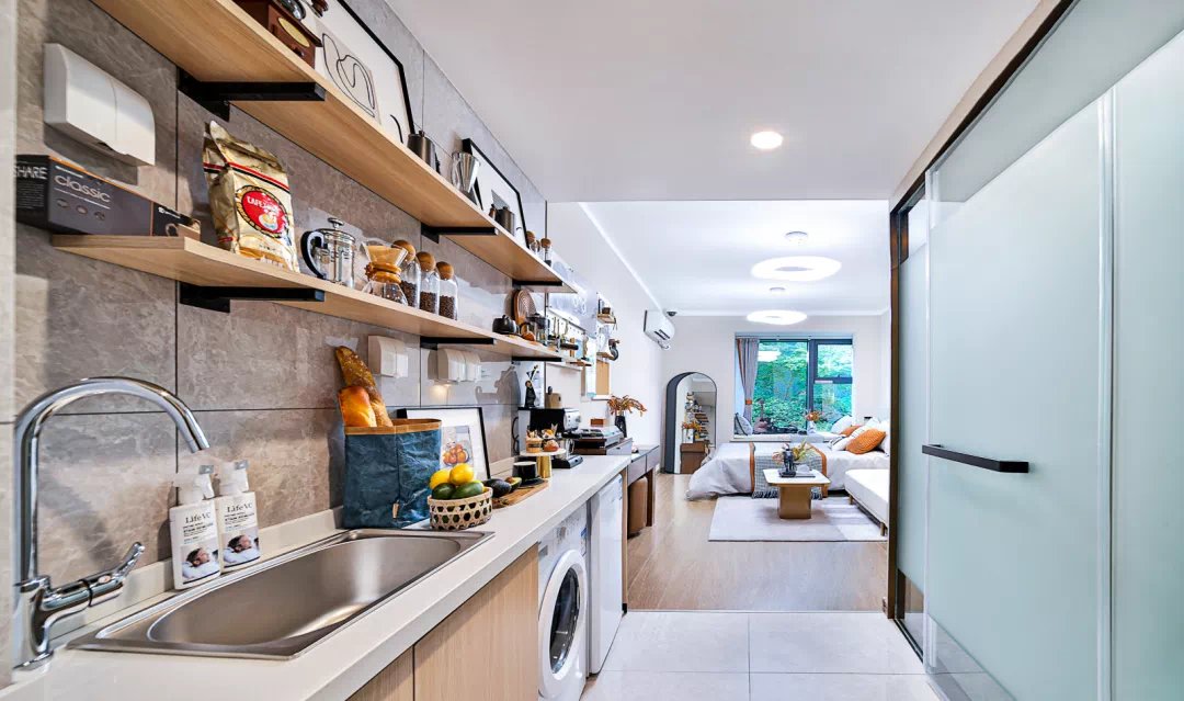 项目为精装修交付,整体装修风格比较简洁清爽。客厅及卧室铺设地板,墙面贴有墙纸。入户门配备三合一密码锁,进门处打造了一个小厨房,操作台下方预留了放洗衣机和冰箱的空间。交付后买房人添置些家具和家电即可领包入住,省心又省力。