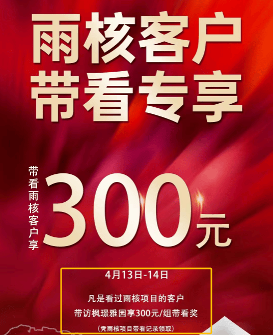 就在刚刚过去的周末,枫璟雅园还针对雨核客户推出了300块钱的带看专享活动。