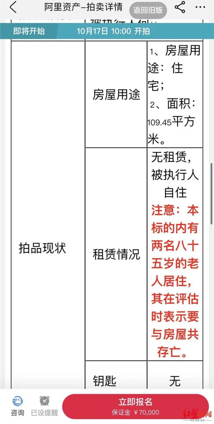 据上游新闻,经办该法拍房拍卖工作的工作人员称,两位老人为被执行人的父母,竞拍者需要考虑自己能不能接受,腾退时间会很长。
