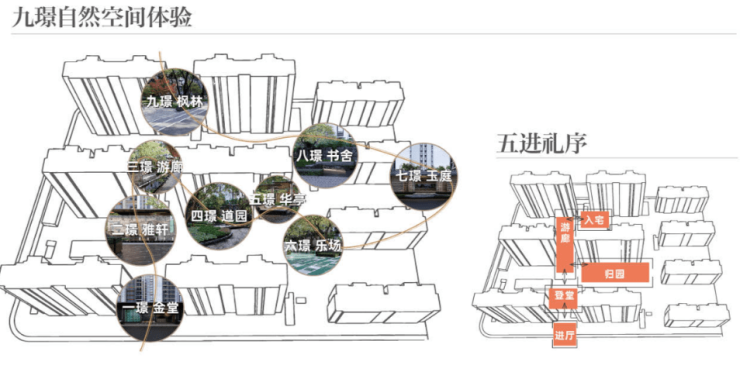 提取堂、轩、廊、山、亭、桥、庭、舍、林等自然元素为设计语言,对应一璟·金堂、二璟·雅轩、三璟·游廊、四璟·道园、五璟·华亭、六璟·乐场、七璟·玉庭、八璟·书舍 、九璟·枫林,作为空间的情绪引导,营造一个风雅的宋式美学园林,引人居游山林共赴一场东方雅集。