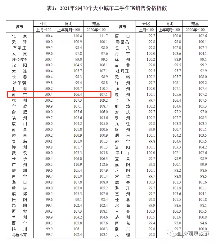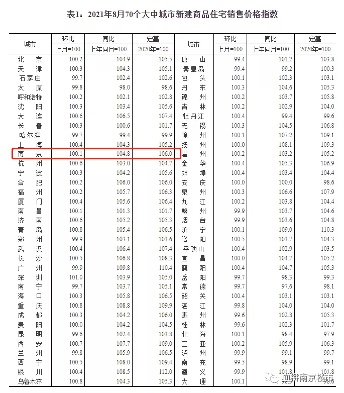 今天上午,国家统计局较新发布了2021年8月份70个大中城市商品住宅销售价格变动情况统计数据。其中,8月南京新房价格环比上涨0.1%、同比上涨4.8%,二手房价格环比上涨0.4%、同比上涨6.4%。