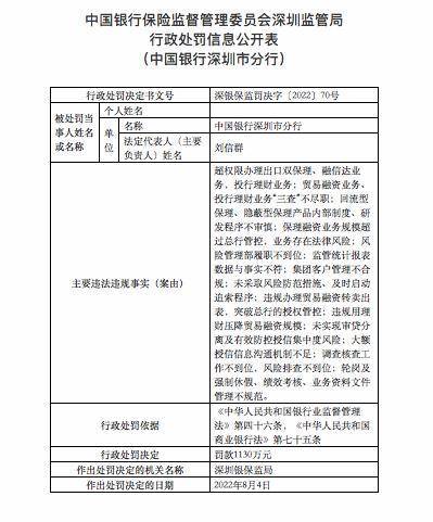 8月5日,银保监会官网披露的13张罚单显示,中国银行深圳市分行存在14项违法违规事实,被深圳银保监局罚款1130万元,12名相关责任人同时收到处罚。