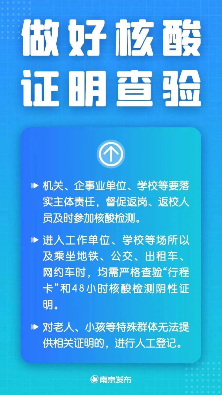 机关、企事业单位、学校等要落实主体责任,督促返岗、返校人员及时参加核酸检测。进入工作单位、学校等场所以及乘坐地铁、公交、出租车、网约车时,均需严格查验“行程卡”和48小时核酸检测阴性证明。对老人、小孩等特殊群体无法提供相关证明的,进行人工登记。