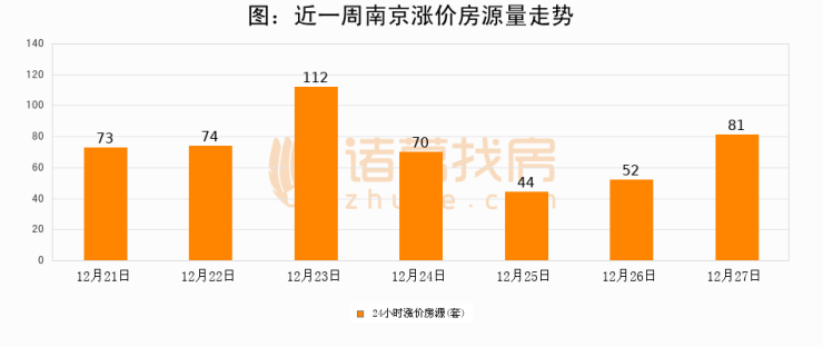 根据诸葛找房数据显示,南京24小时涨价房源量为81套,较12月26日增加29套,环比上涨55.8%。与此同时,涨价房源占比小幅扩大,业主信心有所提升。