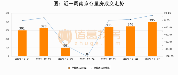 从存量房来看,2023年12月27日南京存量房单日成交395套,比昨日增加49套,环比上涨14.2%。从近一周存量房成交来看,南京存量房日均成交套数为257套,12月27日单日成交395套,高于近一周平均水平53.7%。
