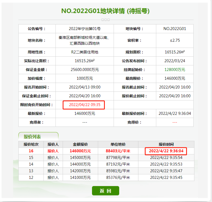 紧接着就是大校场G01地块开始竞拍,开发商出手速度很快,距开拍仅过去1分钟就拍到了较高限价,进入待摇号阶段。
